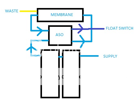 Hello everyone, i'm hoping you can help me out with an issue. I recently added a mechanical float switch to my ro reservoir and also an auto shut off switch on my ro unit. When the float switch triggers the ASO to shut down the water stops running to my reservoir as expected but my ro unit continues to produce waste. I've let it produce for up to 30 minutes before shutting it off manually in hopes that the system was just bleeding off pressure down the waste line but the waste line never stopped flowing. Below is a diagram of how i have the ASO plumbed. Am i missing something? Do i have something plumbed wrong? Any help would be greatly appreciated.